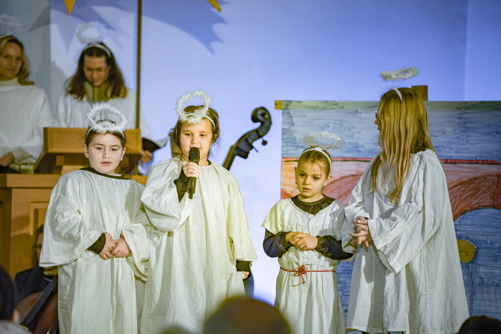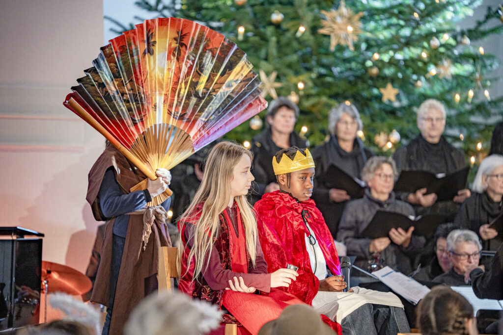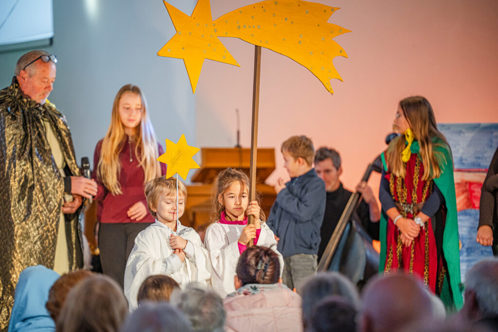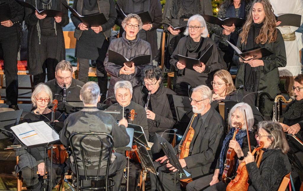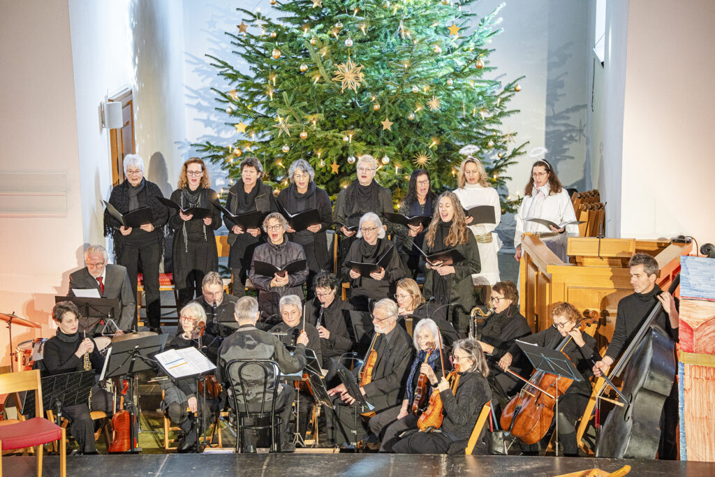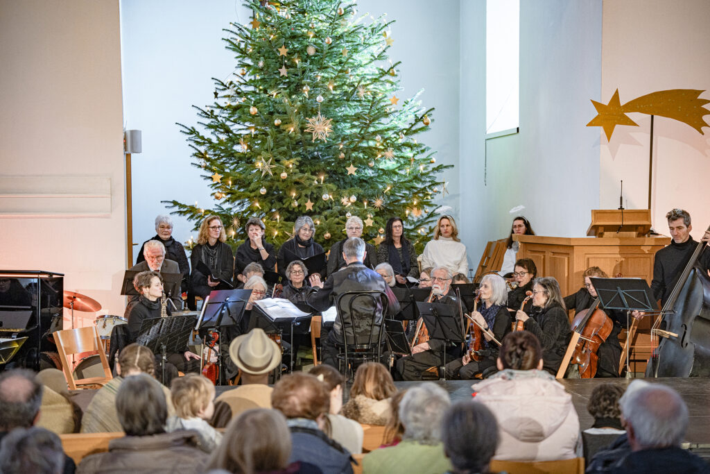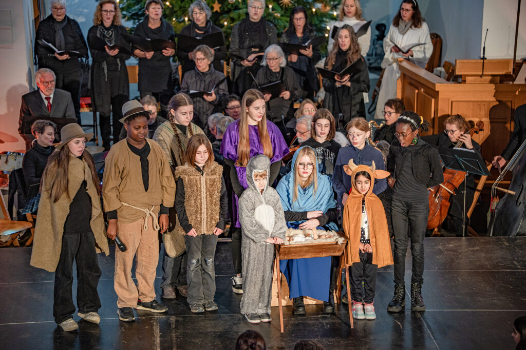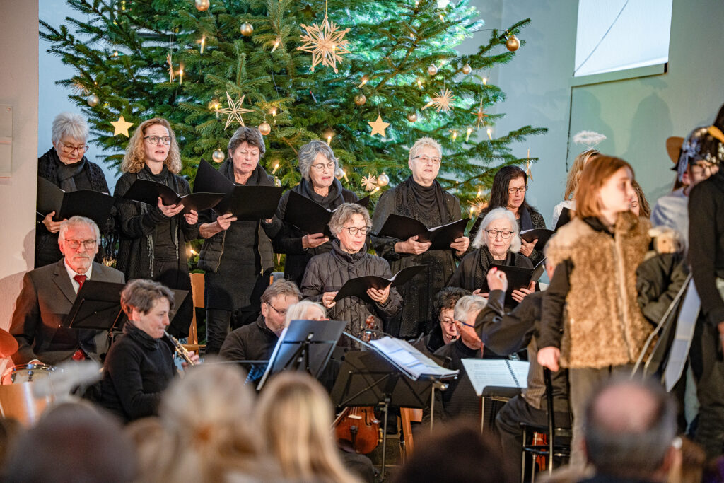 Ebenso wichtig wie die erzählte Geschichte sind im ganzen Werk die eingeschobenen Lieder und Instrumentalmusikstücke. Peter Siegrist durfte als musikalischer Leiter auf einen 12-köpfigen Frauenchor zählen, der mit grossem Engagement die berühmten Lieder, wie «Das isch de Stärn vo Bethlehem», «Kei Muetter weiss, was ihrem Chind wird gscheh» oder «Was isch das für e Nacht» interpretierte. 20 Musikerinnen und Musiker bildeten das ad hoc Orchester, begleiteten den Chor und spielten die Zwischenmusiken. Das von Andreas Habert, Musikschule Glarus, geschriebene Arrangement setzt auf eine grosse Klangvielfalt mit Streichern, Holz- und Blechbläsern, sowie Akkordeon, Klavier und Perkussion.