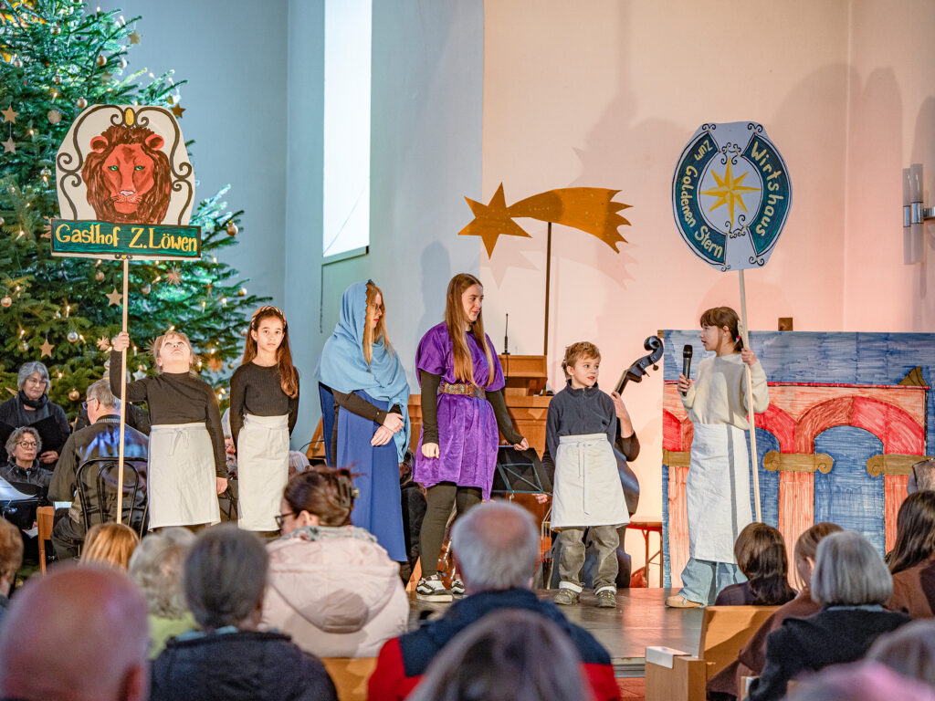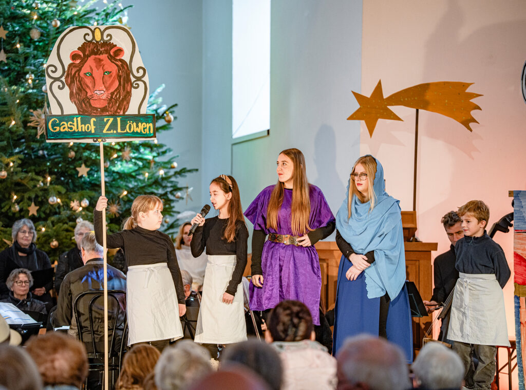 «D’Zäller Wiehnacht» wurde von der Reformierten Kirche Reinach-Leimbach als eigentliches Generationenprojekt realisiert. Die jüngste Spielerin war fünfjährig, die älteste Musikerin war 87 Jahre alt. 36 Kinder und Jugendliche und drei Erwachsene standen auf der Bühne und erzählten in verschiedenen Szenen die bekannte Weihnachtsgeschichte aus der Bibel. Die Szenerie besticht durch ihre Einfachheit, die Bühne kommt ohne Kulissen aus. Mit schlichten Kostümen hat Susanne Hunziker die nötigen farbigen Akzente gesetzt. Pfarrerin Maja Petrus war verantwortlich für die Inszenierung, und sie hat mit viel Liebe zum Detail und grosser Energie die Kinder in ihren Rollen geführt. Wohltuend war für die Zuschauer zu hören, wie deutlich und verständlich die Texte gesprochen wurden.